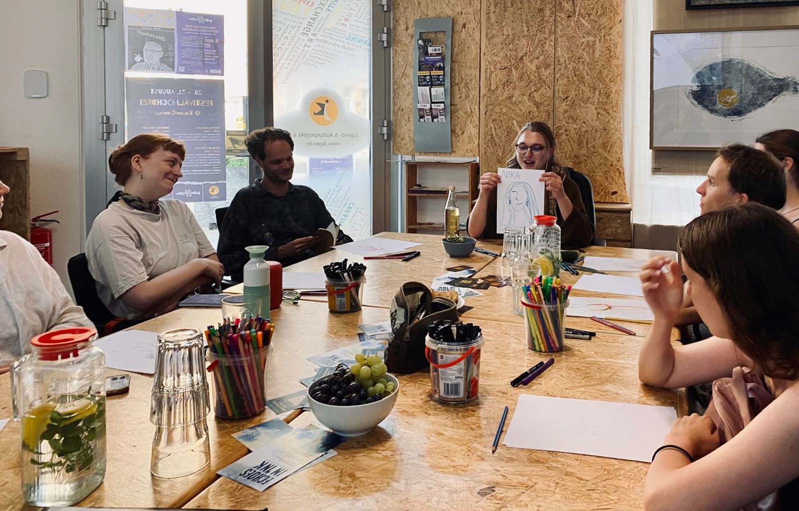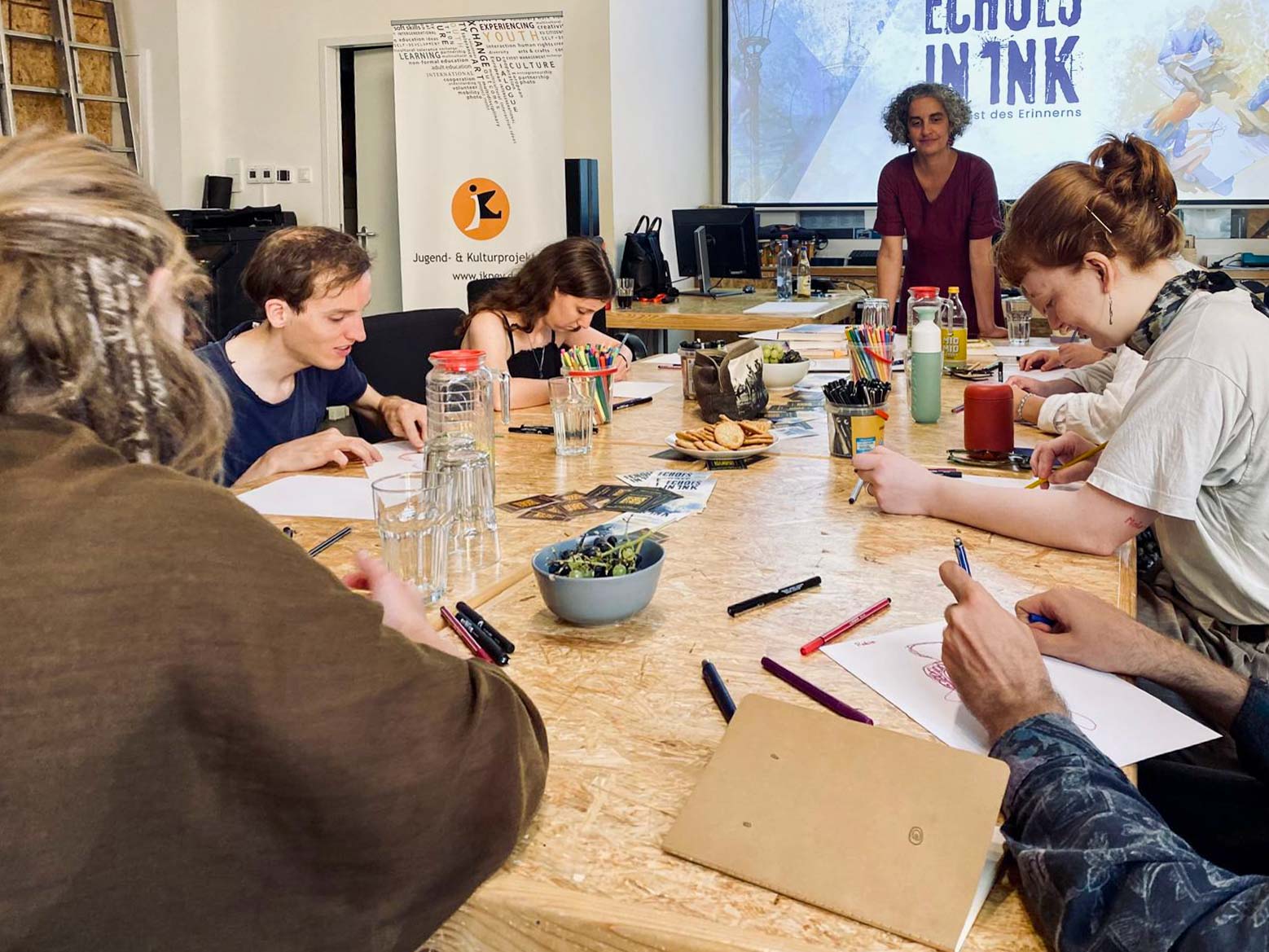 Im Kreativ-Workshop “Visuelles Erzählen” mit Nazanin Zandi verarbeiteten die Teilnehmenden ihre Eindrücke aus dem Stadtraum kreativ. Durch erste zeichnerische Experimente im Stil der Graphic Novel wurden historische Inhalte emotional und visuell erfahrbar gemacht. Die Verbindung von Ort und Bild diente als Einstieg in die Verbindung von Geschichte und künstlerischem Ausdruck.